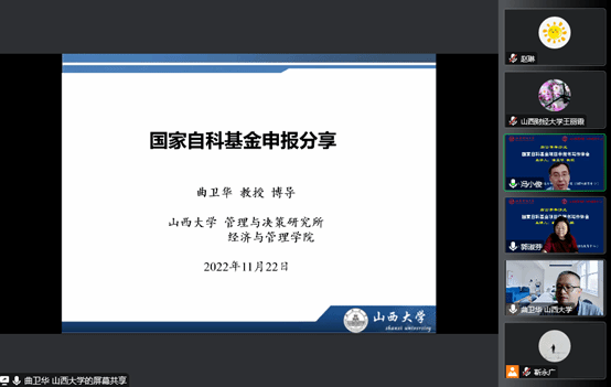 通过“尚公青年沙龙”学术平台举办第五场国家级科研项目申报经验交流会,山西大学教授、博士生导师、2项国家自然科学基金面上项目(管理科学部)主持人曲卫华做了《国家自科基金申报分享》的报告,副院长冯小俊主持了交流会,100余名校内外师生在线参加了经验交流会。