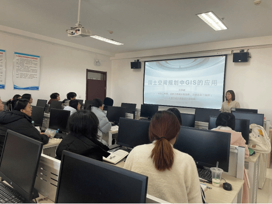 刘李霞主任结合自身在国土空间规划领域的丰富经验,介绍了国土空间规划体系改革的背景,并以市国土空间规划编制为例,详细介绍了规划编制工作流程,并通过ArcGIS软件的实操演示,向同学们展示了GIS在国土空间规划中的应用场景。她强调GIS不仅是技术工具,更是一种思维和工作方式,鼓励学生要重视理论学习,通过理论学习与实践运用相结合,才能使自己的职业生涯走得更远。课程结束后,刘主任围绕学生实践、企业招聘等方面与学生进行了热情交流与互动。