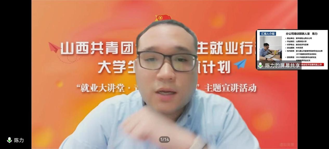 团委以线上腾讯会议形式组织开展“就业大讲堂·青年榜样进校园”主题宣讲活动。本次宣讲活动特邀2022年度优秀毕业研究生陈力和2023优秀毕业本科生韦自强作为分享人,会议由团委书记王琼主持,各团支部代表踊跃参加。