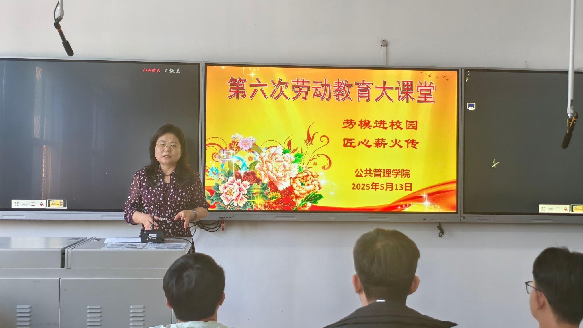“劳动教育大课堂”现场授课,学院2024级全体本科生和部分教师听课,院长郭淑芬主持活动。