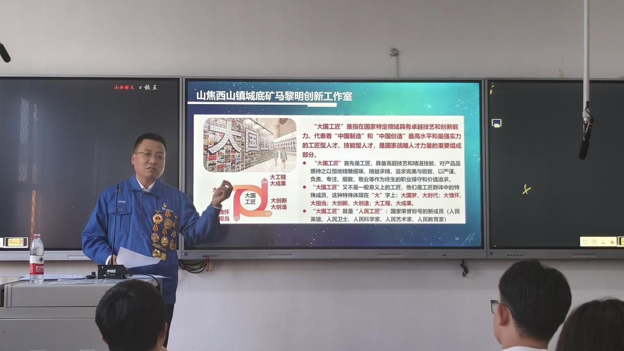 马黎明以“匠心筑梦・劳动致远”为主题,结合自身从普通矿工到创新先锋的成长轨迹,以饱满的精神与精彩的成长镜头,向学生传递了自己的感悟,一是以热爱锚定职业方向,劳动不是负担,而是成就人生的基石;二是以创新突破技术壁垒,创新不分大小,人人皆可突破;三是以担当践行青年使命,以“国之大者”为己任,把个人理想融入国家发展。他鼓励同学们,要以敬畏之心求知,以匠心之志实践,以坚守致初心,以奋斗敬时代,用青春与奋斗书写新时代匠心华章。