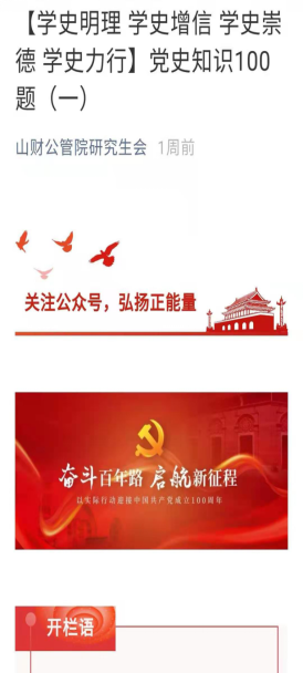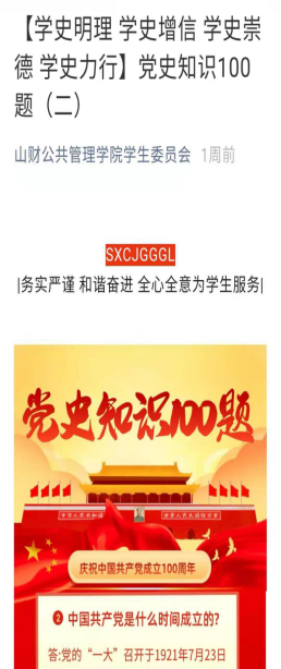 于3月10日起,利用学生会、研究生公众号平台推出“党史知识100题”学习专栏,精选100道有关党史知识题目,采取每天一题定时推出的形式,引领青年学生重温历史,汲取力量,做到学史明理、学史增信、学史崇德、学史力行。